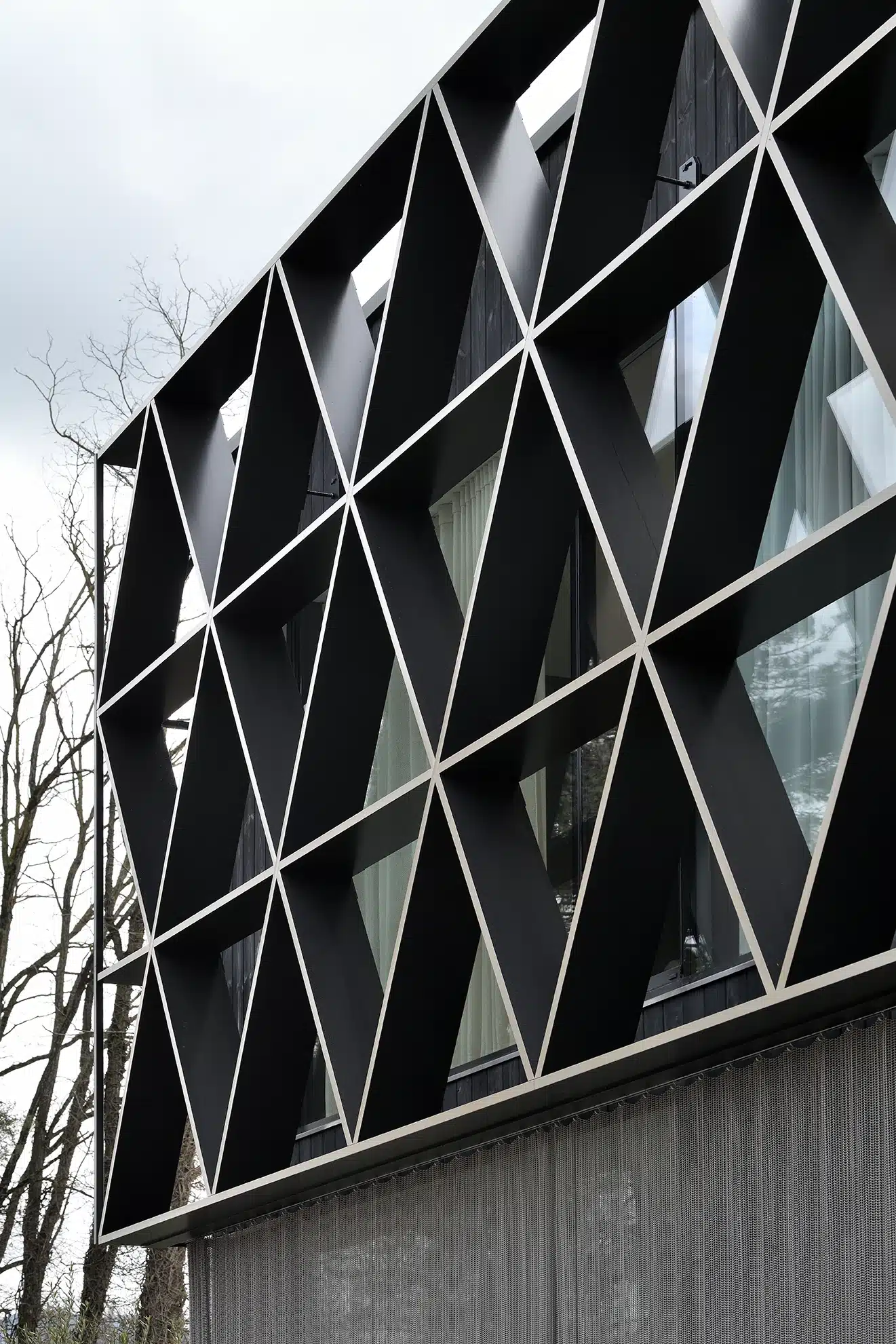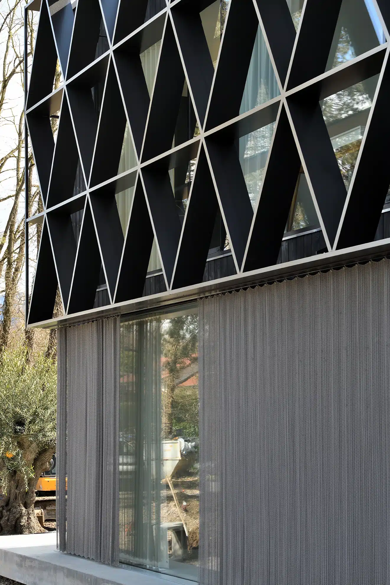 Au bord du Lac Léman, dans un site exceptionnel, ce projet a été conçu comme une réponse à son environnement, un dialogue avec les vues sur et depuis le lac, la végétation existante et la topographie du lieu. Construite sur pilotis afin de respecter au maximum le site qui l’accueille, la maison surplombe le lac et la végétation. Elle est composée de deux volumes simples, l’un dédié aux occupants, l’autre à leurs visiteurs, réunis par leur toiture et tournés vers le patio central arboré qui invite la végétation au cœur du bâti. La maille métallique utilisé dans ces rideaux permet de filtrer efficacement la lumière du soleil, créant un environnement frais et confortable à l'intérieur de la maison. De plus, son design permet de maintenir l'intimité des espaces extérieurs, protégeant des regards indiscrets sans bloquer complètement la vue vers l'extérieur.